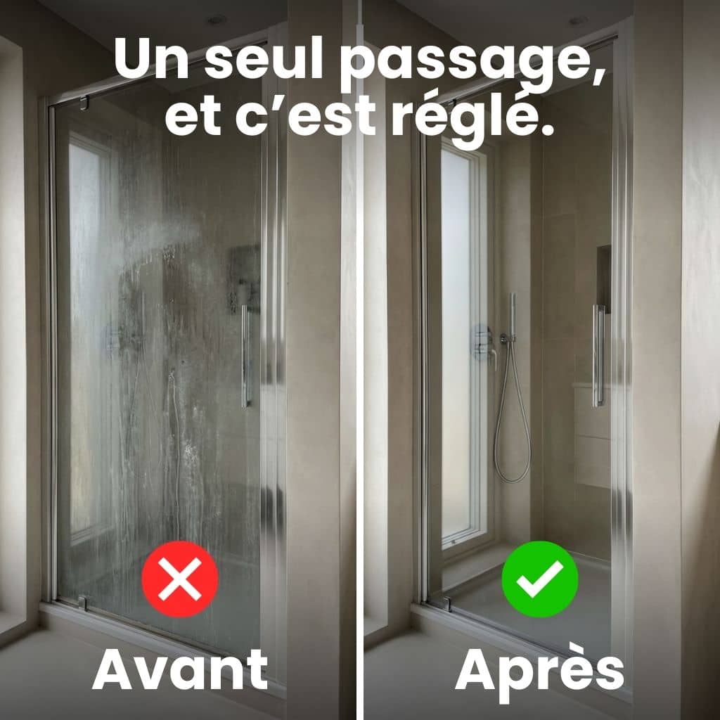 En quelques passages rapides, votre paroi de douche, vos carreaux et votre robinetterie sont impeccables. Sans produits agressifs. Sans traces. Sans stress.