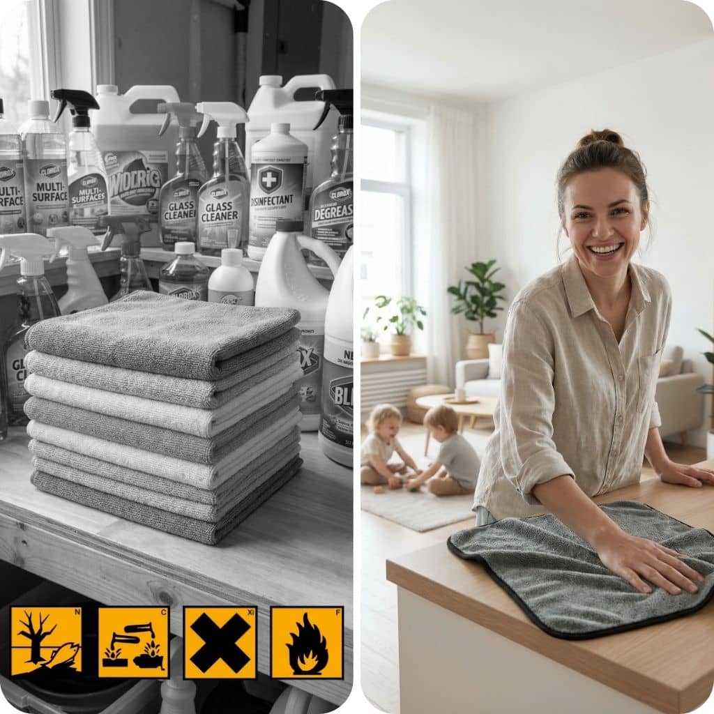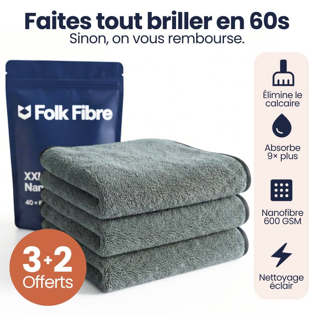 Après 2 ans de tests, nous avons créé la Serviette nanofibre XXL FolkFibre. Déjà adoptée par plus de 8 418 mamans, mamies et parents débordés partout en Europe, lassés de frotter et de gaspiller leur argent en sprays.