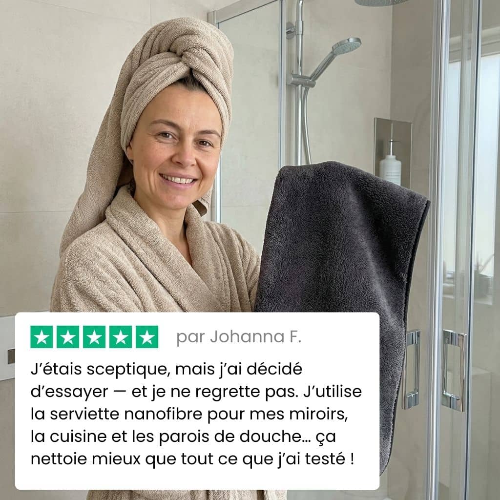La serviette nanofibre l’attrape, le retient, et vous évite la boucle “je repasse encore”. Pas besoin d’une technique spéciale. Vous essuyez, et vous passez à autre chose.