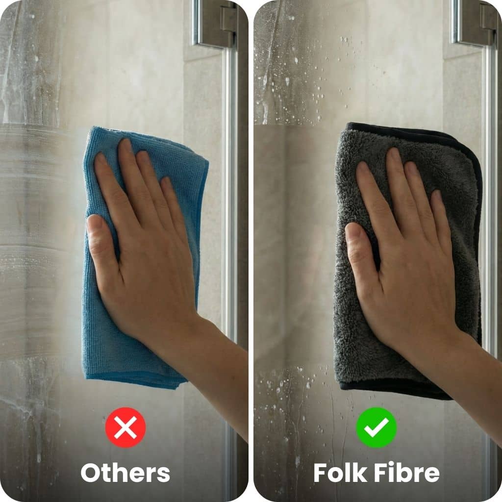 Most cloths push water and soap film around. Folk Fibre lifts it, holds it, and stops the re-wipe loop.